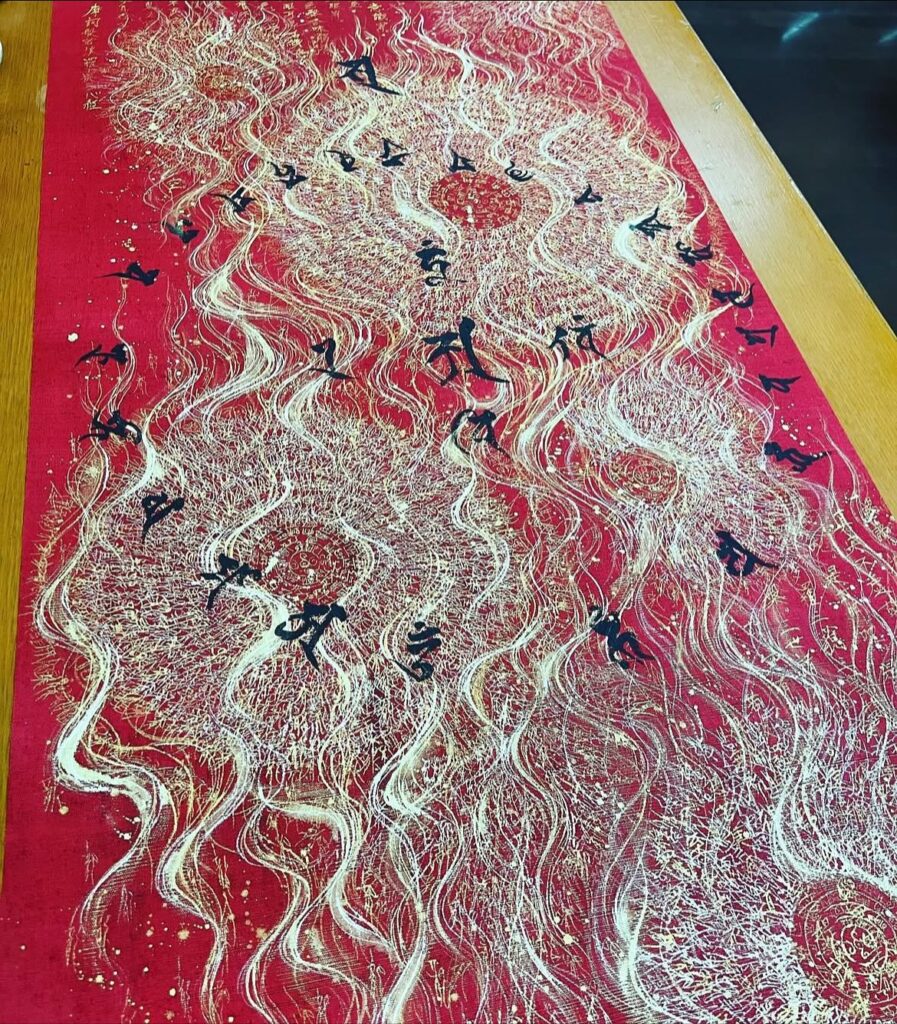 麻布に純金・銀・プラチナ・墨を用い、祈りと響きを描く作家。聖地を巡り、作品ごとに対応する聖水を採取し、古代文字や龍体文字を織り込むことで、目に見えないエネルギーの調和を可視化する。光と闇、現実と霊性の境界を揺らすような作品群は、見る者の内なる祈りを呼び覚ます。