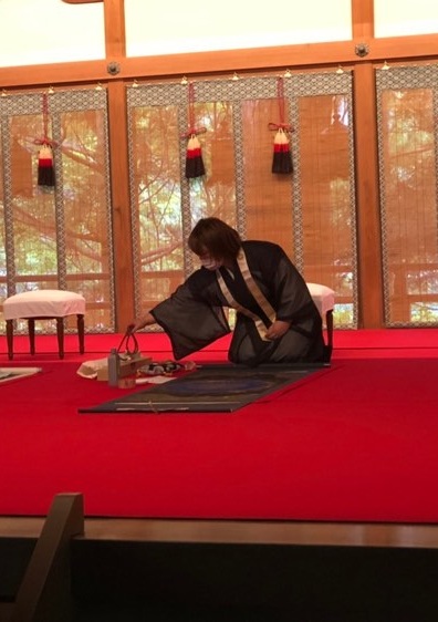 作品の題材に呼ばれるように、聖地を訪れ、御神水を汲みます。その清らかな水は大地の記憶を宿し、作品の一部となります。